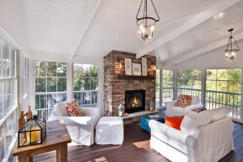 The high contrast, rich plank floors are Trex Lava Rock. This maintenance-free product provides the look of wood without the maintenance. EZ screen windows allow the homeowner to enjoy this porch over 300 days of the year, by keeping the warmth in and the elements out. The porch has become an extension of their home.