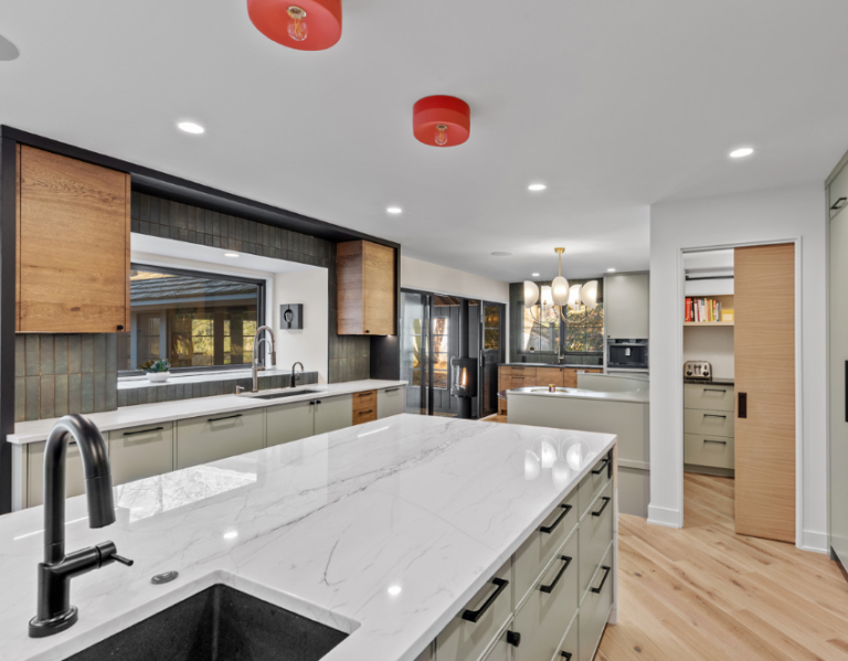 Although this home’s layout worked well for its owners, almost every material was outdated, including the failing existing windows and rotten joists in the sunroom. The renovation— which encompassed gutting the entire main level down to the studs and replacing all the windows—provided the perfect opportunity to solve these problems while giving the owners a chance to reimagine the entire space.