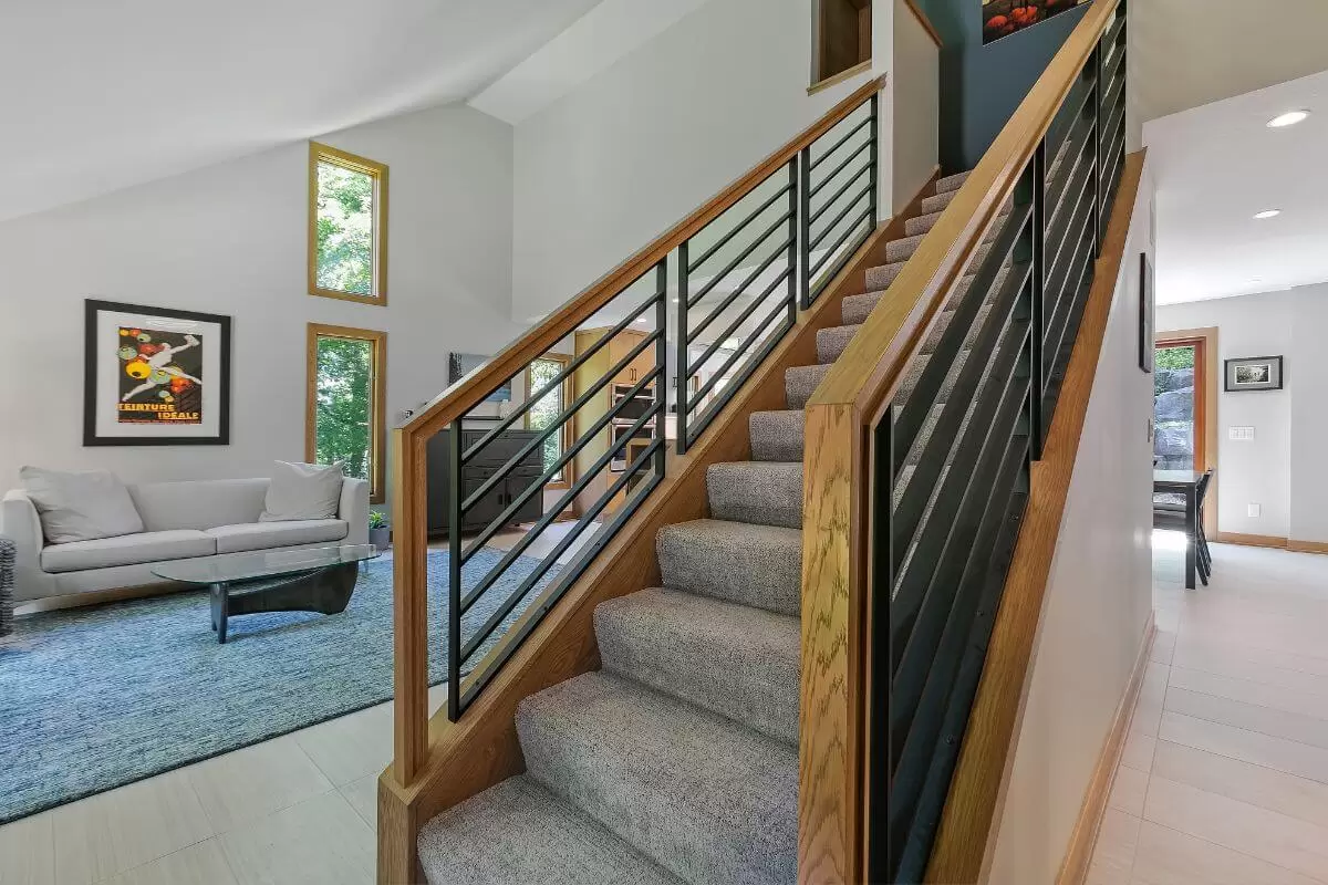 Modern Warmth – The whole main floor was remodeled to be sleek, clean, and bright, balanced by the natural warmth of quartersawn white oak cabinets and millwork. The entry stairs wow with a unique combination of wood and black metal infill panels. Custom wood waterfall island top appears to float over the island work space. Geometric tile backsplash to the ceiling, floating shelves and custom island hood, add texture and interest. Tile floors cohesively tie the entry, living room, kitchen and mudroom together. New carpet in the family room softens the space. Soothing palette of soft wood tones and subtle earthy grays.